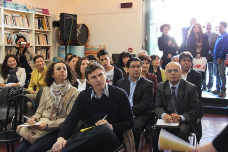 In prima fila giornalisti del Secolo XIX e del Corriere Mercantile. Dietro Homrouni Mohamed, addetto consolare della Tunisia, Ivàn Flores, rappesentante Segreteria Nazionale del Migrante del Governo dell'Ecuador (SENAMI). Terza fila Byron Salas, pittore ecuadoriano.